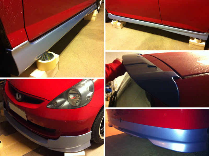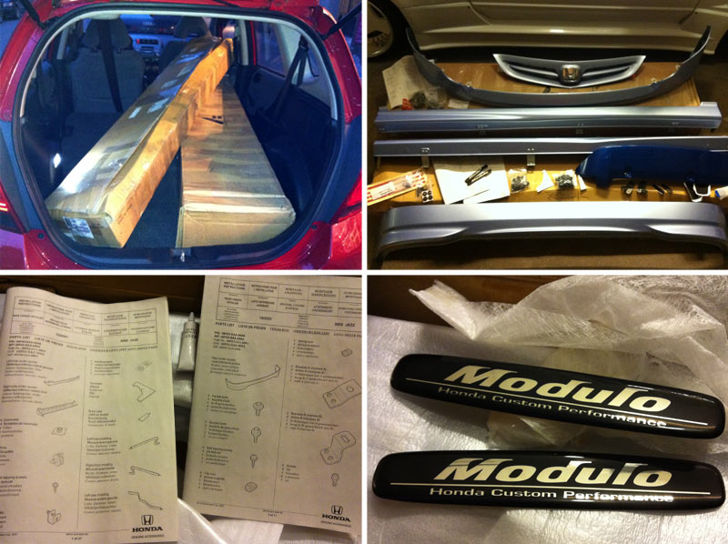 I scored a brand new full genuine Modulo Honda Custom Performance GD1 -kit for my EDM Jazz/Fit. It has everything included, all the bits & bobs to mount this kit. The kit is quite a rare find. It's painted Ice Blue (wing Blue Sensation Pearl), so it needs a new paint (Milano Red R81) to match my Fit.
