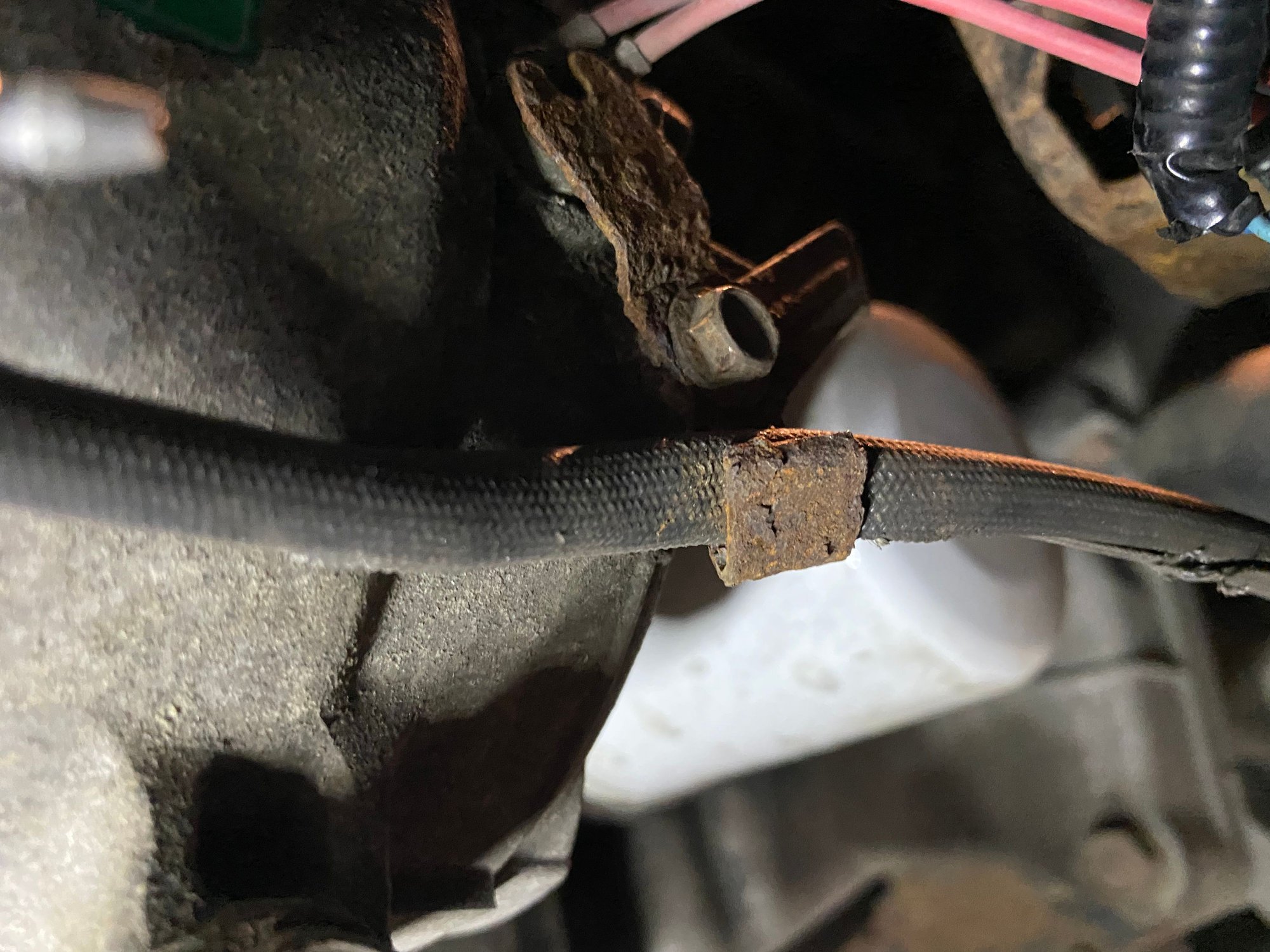 You can see a clean break in both thermal switch wires where they were clamped in the bracket. Vibration fatigued them like a paper clip that gets bent over and over. It was under the braided loom and the wire insulation was intact. I pulled on the wires and they broke. The insulation must have maintained continuity when cold and under heat the insulation expanded and broke the circuit.