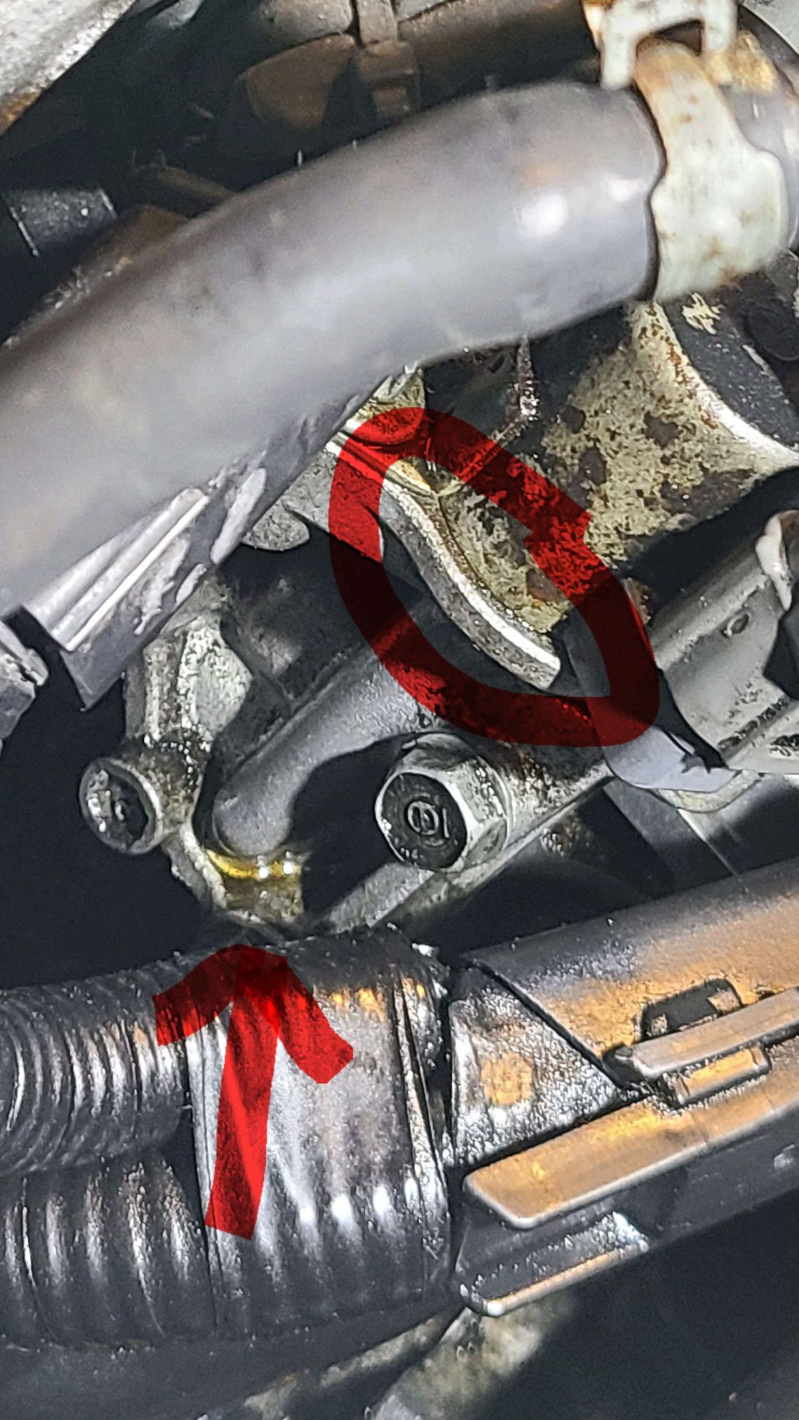 Friend noticed leak from circled area. Fresh oil where arrow is pointing.