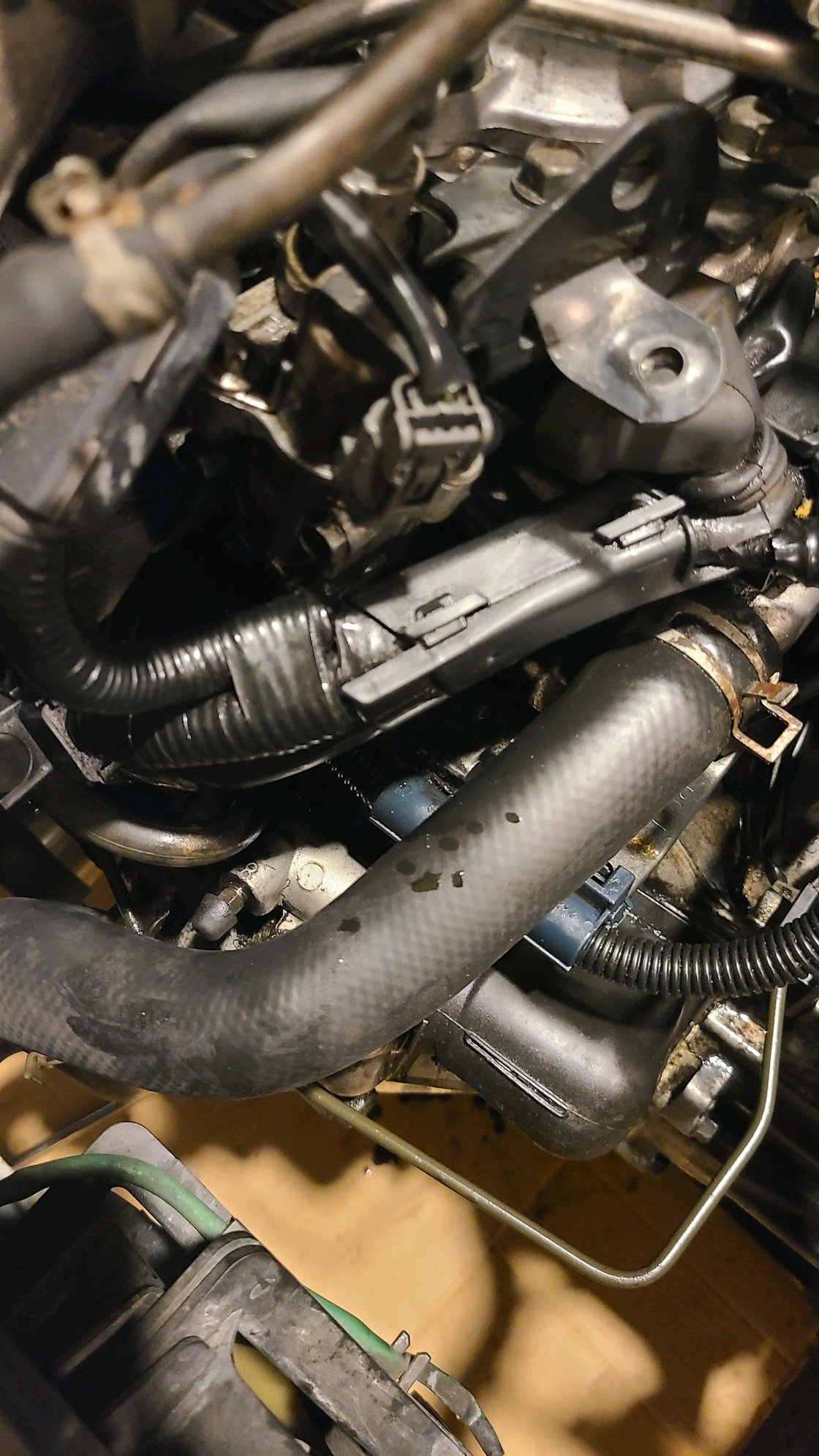 I'm not sure if vtec will engage if the engine is free revving vs under load (maybe somebody can chime in on this matter). The leak while I revved the engine seemed concerning, but not at a rate which would equate to covering that side of the engine in pools of oil. In the second photo, taken immediately after having replaced the cam thrust cover seal, I noticed a few drops of oil on the radiator hose. This is what initially led me back to the spool valve. But seeing how far the oil traveled, it must be spraying out when vtec is on. I'm not sure if if whatever seals the solenoid on the spool valve assembly is replaceable so I'll order a new oem spool valve and pray that solves this issue. Will update when I replace spool valve. Mahalo friends.