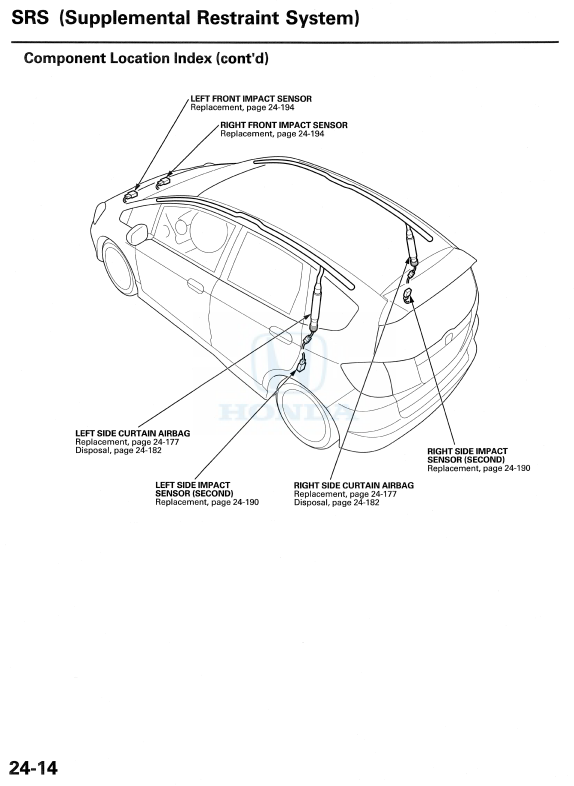 From the 2009-2012 service manual, which I downloaded for free. There are pages and pages about the SRS system, but here's the sensor location information.
