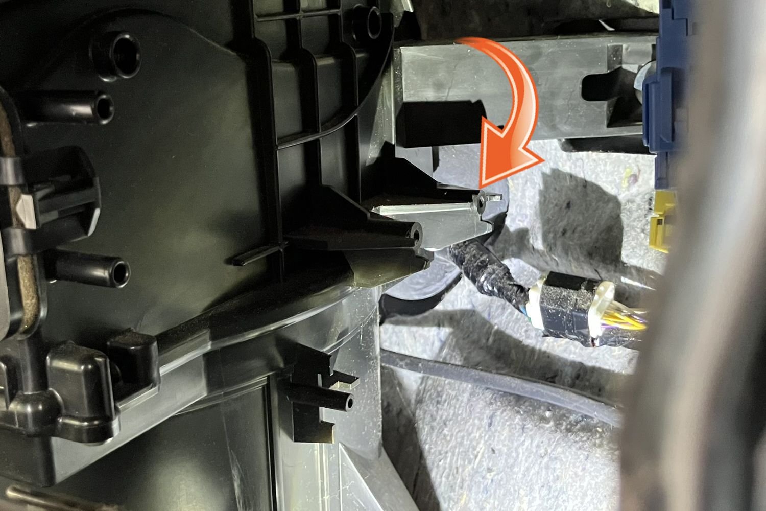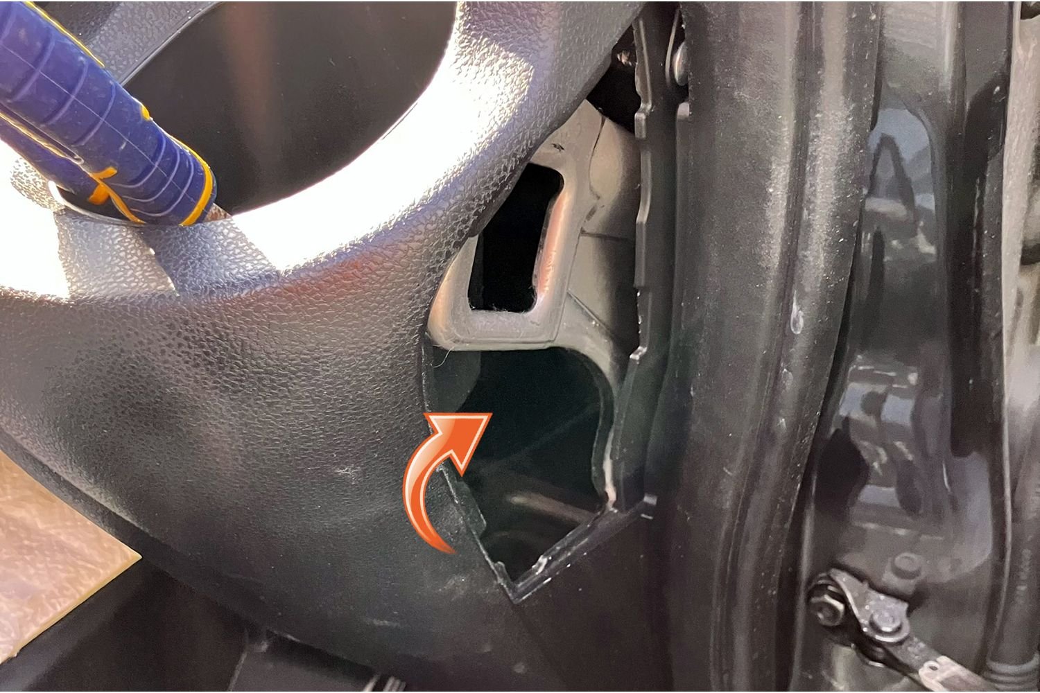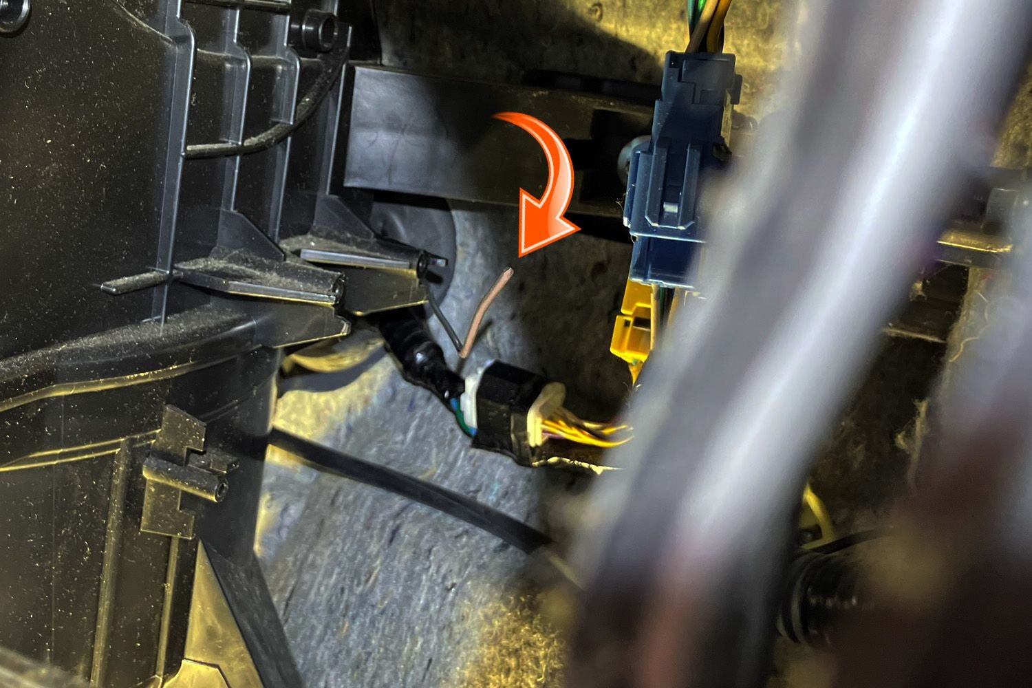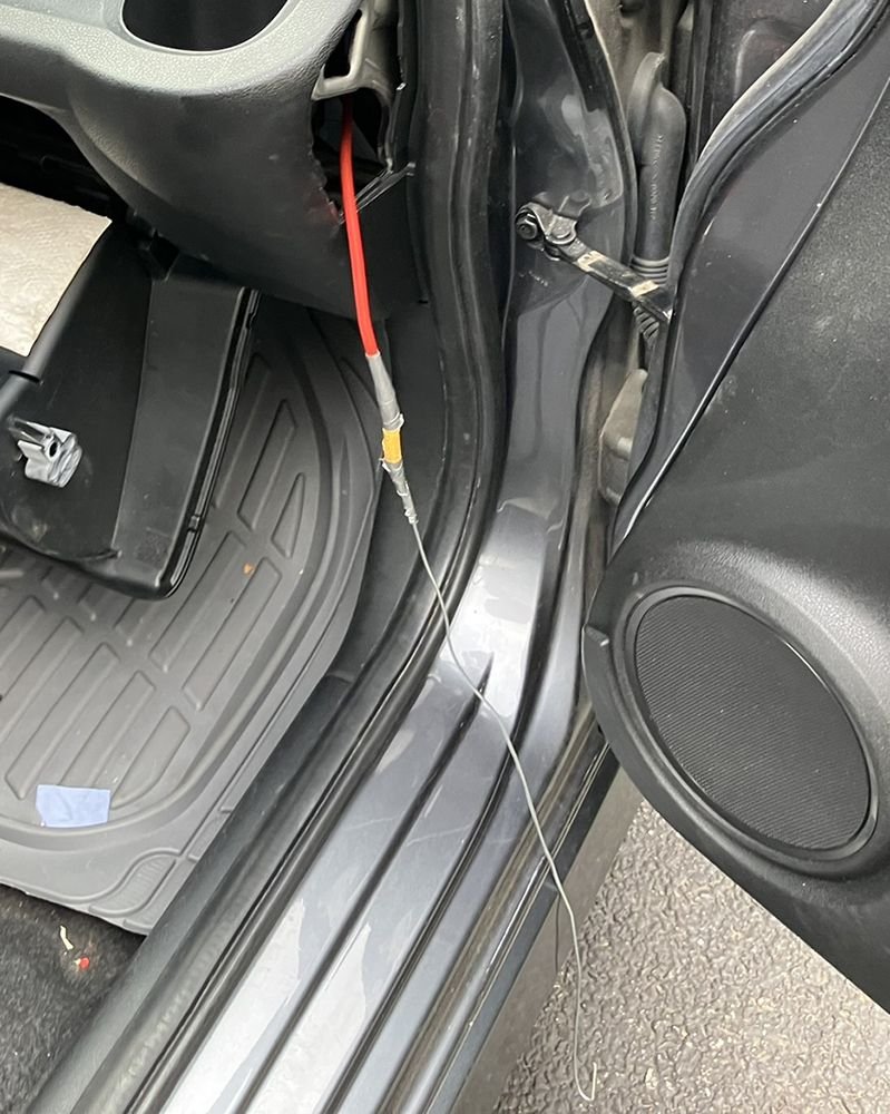 None of the holes that other install posts and videos really worked for me. They are all really great, but just did not address what I was facing. I am a big guy, so squeezing down under the dash is uncomfortable at best. Then I found a hole on the passenger side that seemed to work. It had a large, soft gasket, relatively few existing wires and what appeared to be plenty of open area on the grommet to safely poke a line through. After fretting about it for a couple weeks, I just went for it. If I screwed it up, at least I knew where I did the damage. A simple 16 gauge stainless steel wire (like the type used for electric fences) was enough of a tool for the task. It was thin, pliable, but would stand up to the force of being pushed. I cut a small section, put a light point on one end with a grinder and securely taped the power cable on the other. I did not use any lubricant as I was worried it may degrade the soft gasket. Instead, the duct tape provided enough slippage.