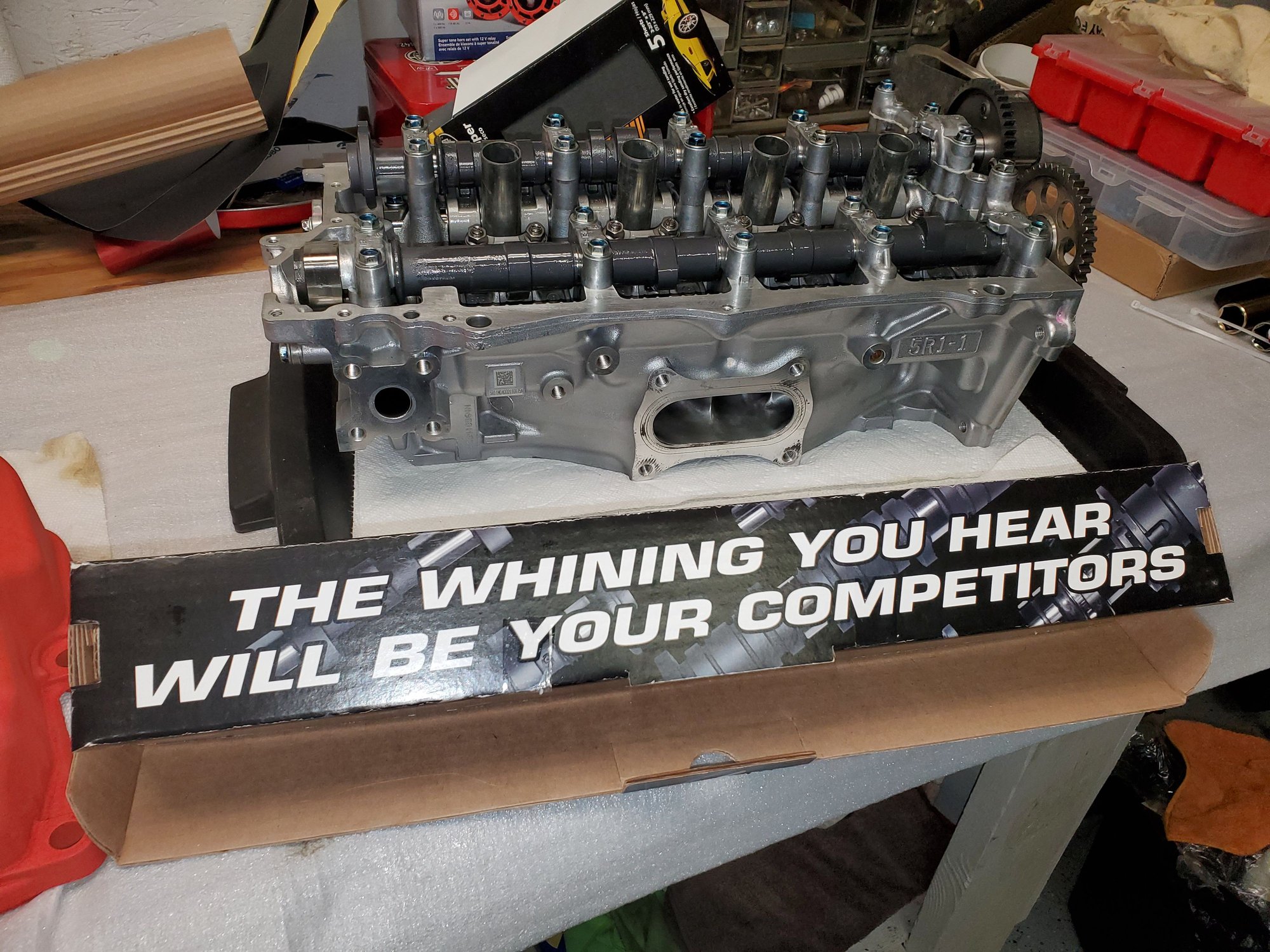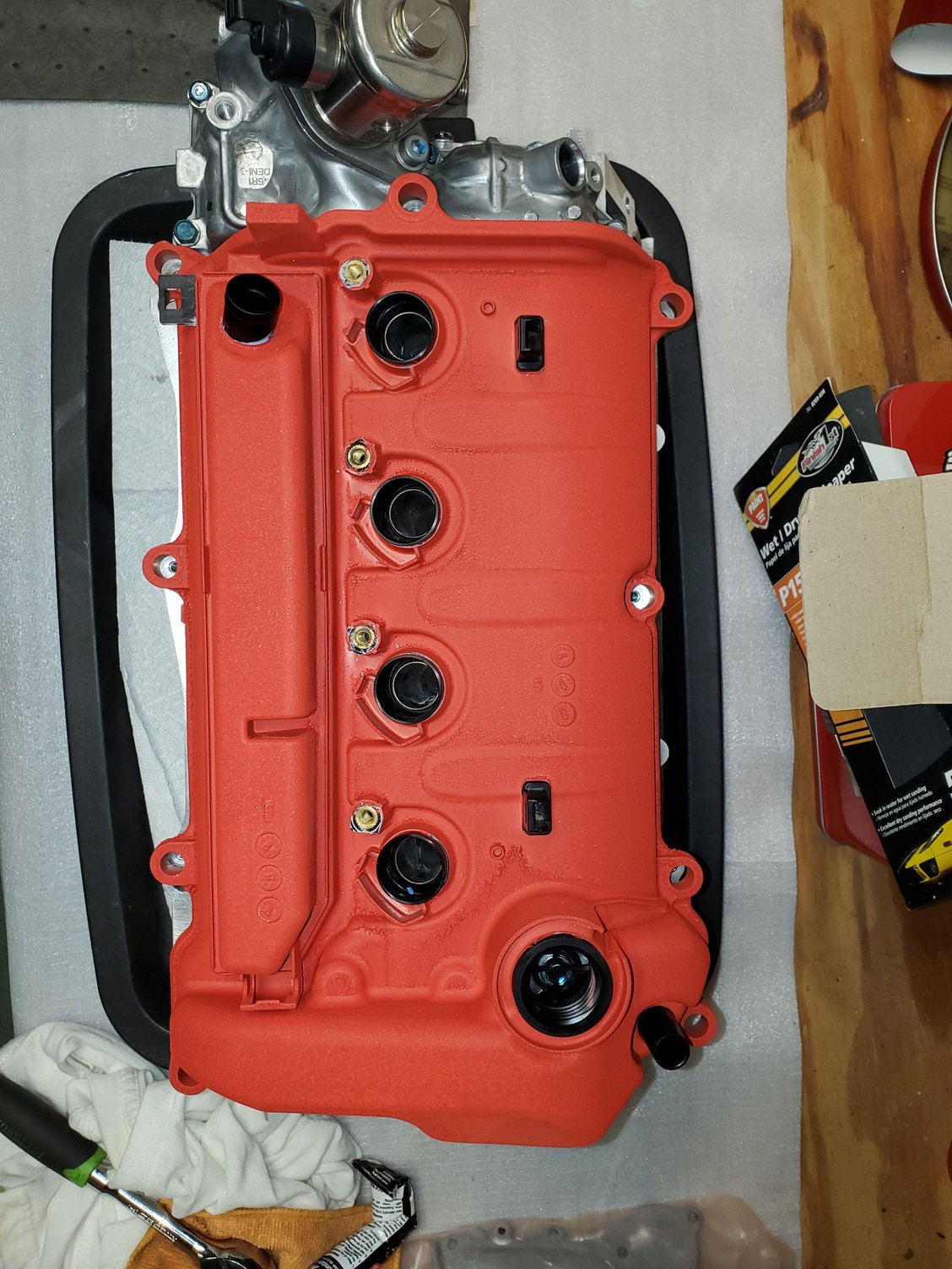 Finally received the exhaust cam gear and put the rest of the head together. Block is STILL at the builder. Main bearings had to be ordered from dealer, so, with more time to waste i crinkle painted my valve cover for that Integra Type R look. It's not perfect but I do have another one .