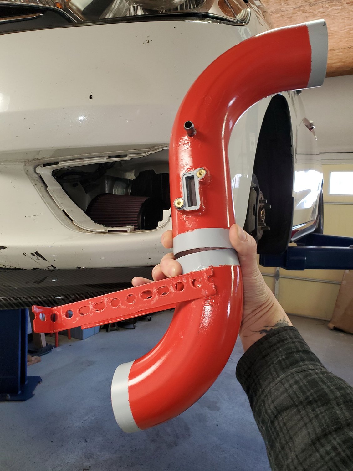 Over here, I'll bolt on my custom lower intake pipe and 3" knn cone filter...