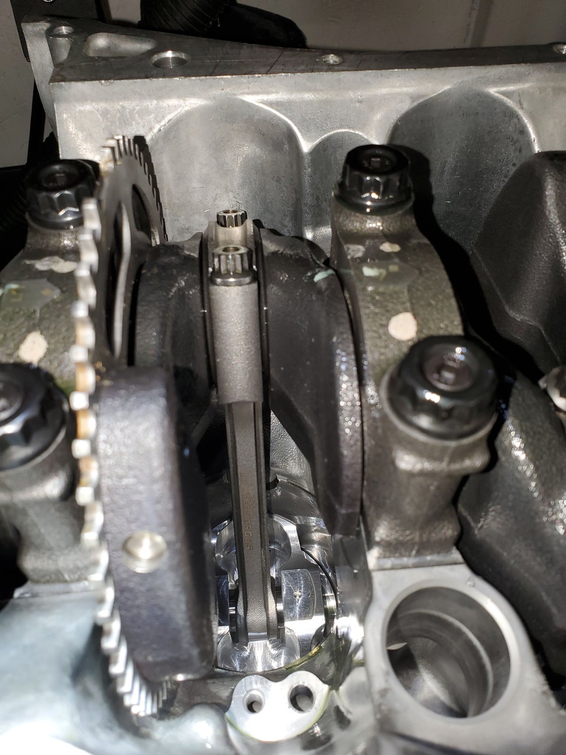 I used the flex plate in a previous photo with two flywheel bolts to turn the motor to install the piston oil squirters.