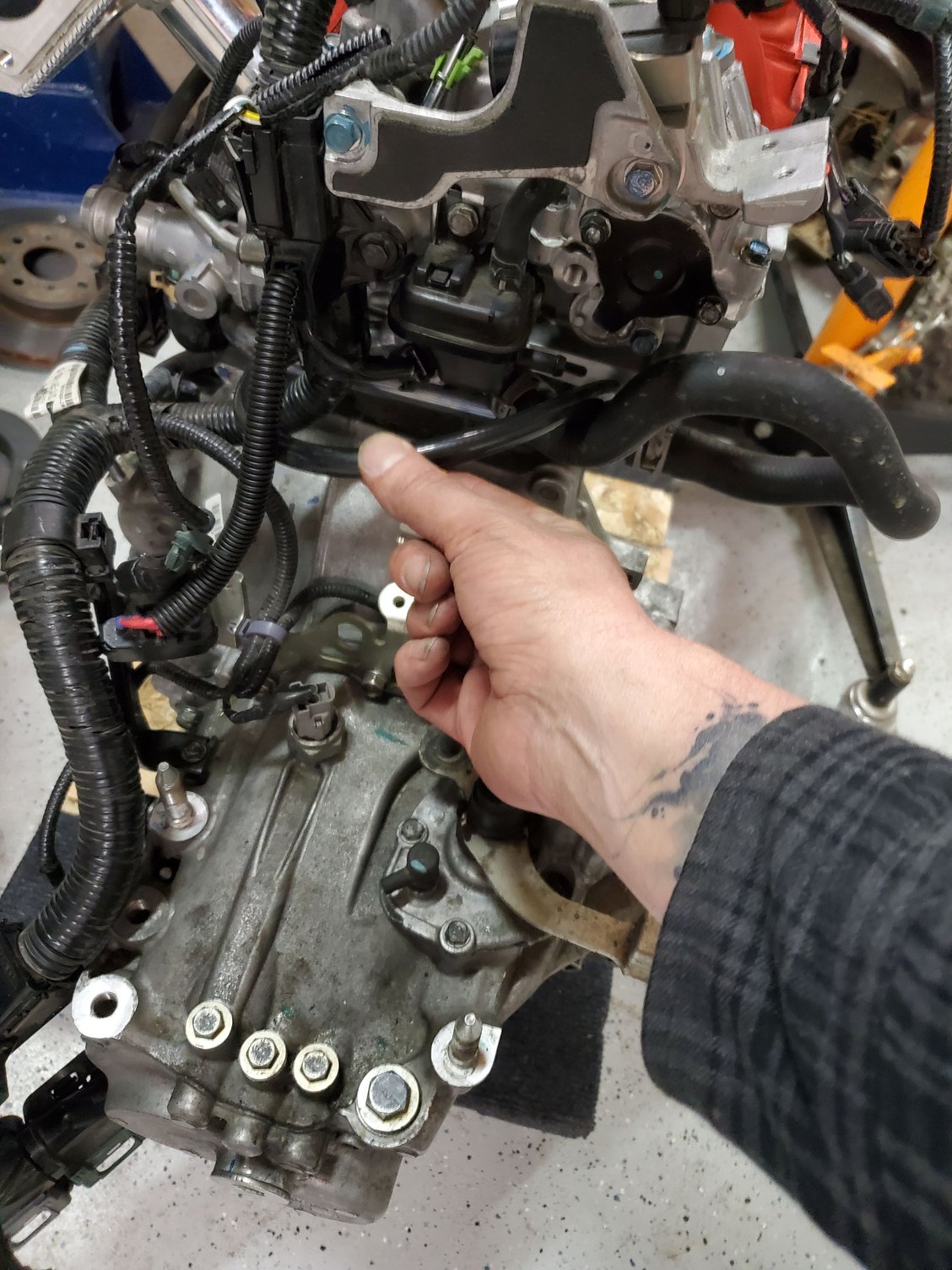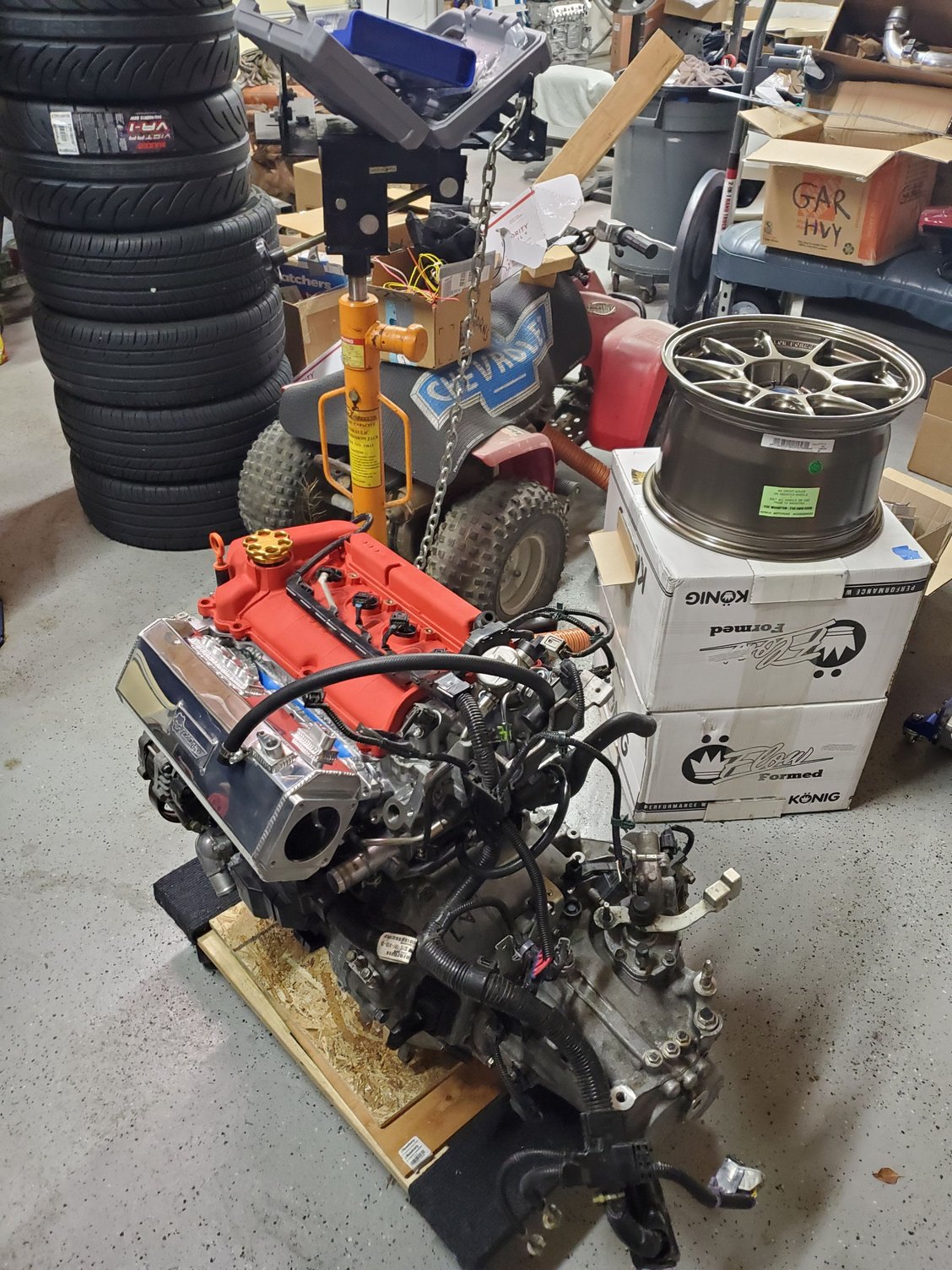 It's not as bad as I thought but I do have two fit engines in disrepair in my garage... I need to go buy Golden Eagle and Web Cam compliant break in oil, I think just straight 30W Valvoline. Need to trade in my Duralast Gold battery at AZ, and get an oil filter. PCV valve looked fine. The injectors were an interesting puzzle. There's a clip I accessed from below to free the grip on the injectors. It all came off as one so who knows, maybe I just had to pull harder... I rigged a bracket last time to torque the flywheel bolts but I couldn't figure out where lines up. Punch drunk too much caffeine. Oh, peep the new gear!!!