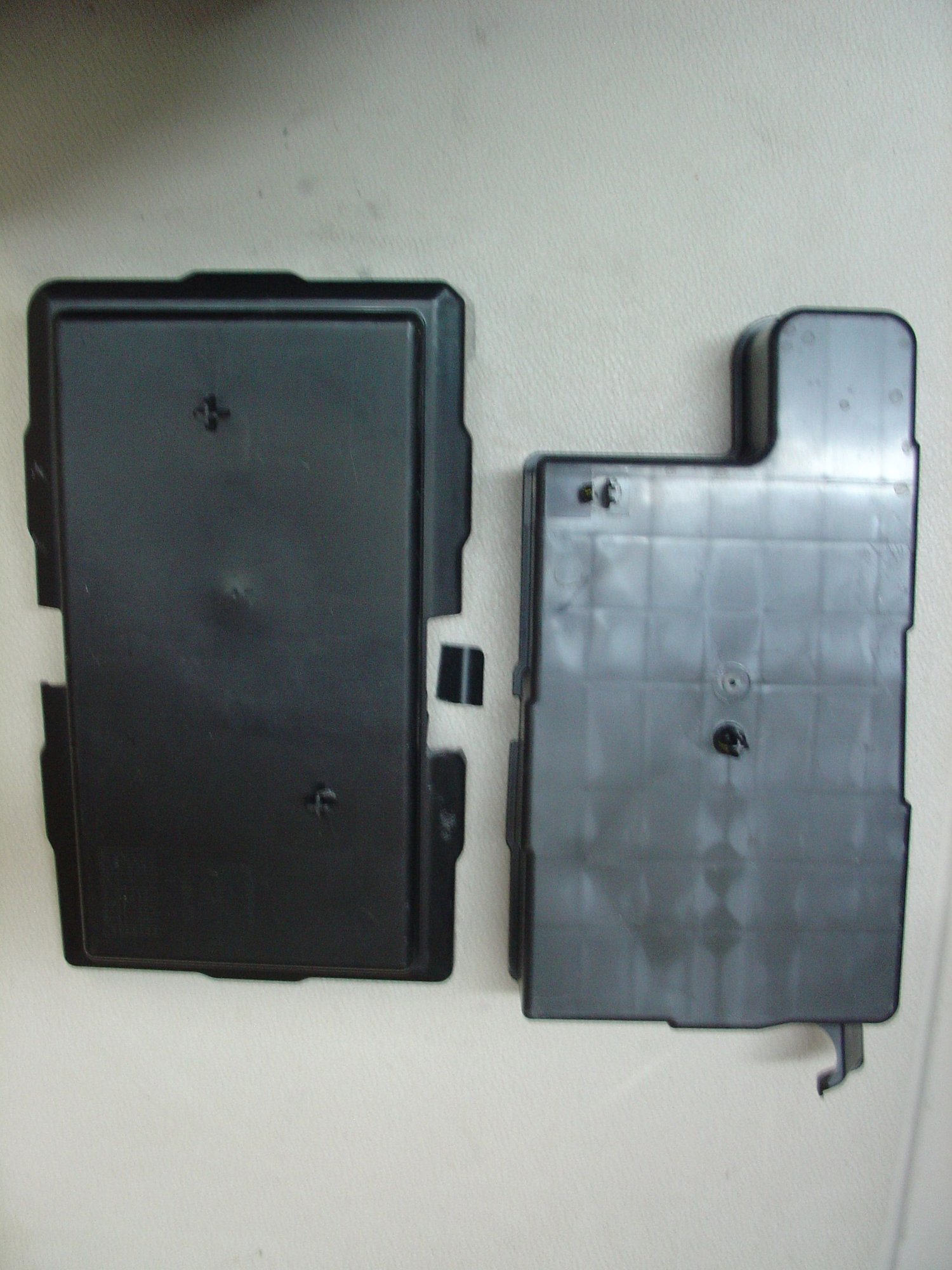 Bottom of both battery boxes...new box on left with 2 nubs ...oem on right with 1 nub which fits into metal tray in engine bay. 2 nubs new tray don't fit oem metal tray but I left them uncut. Small piece 2-3 cm next to right side of new box I had to cut to fit oem holddown clamp.