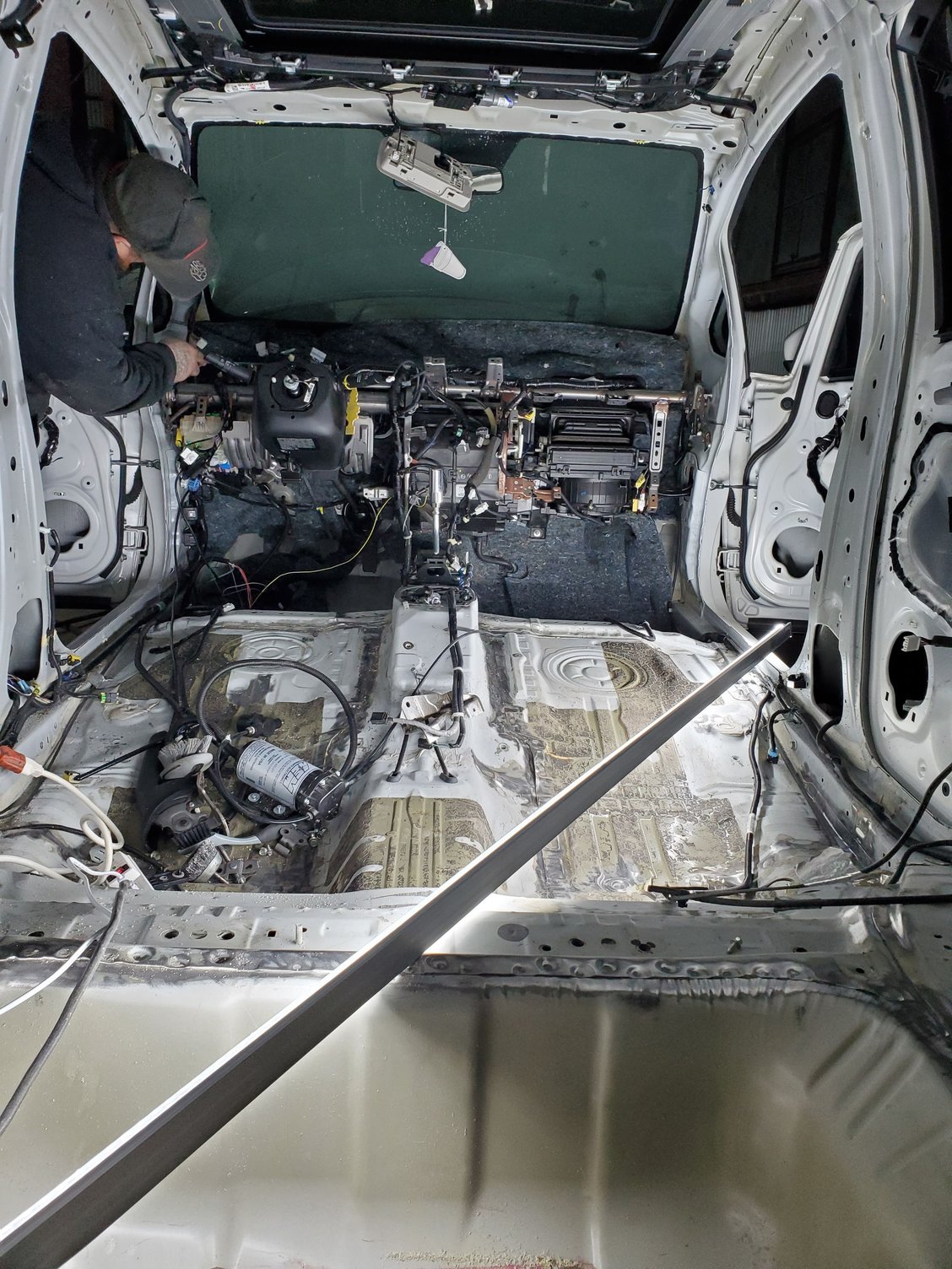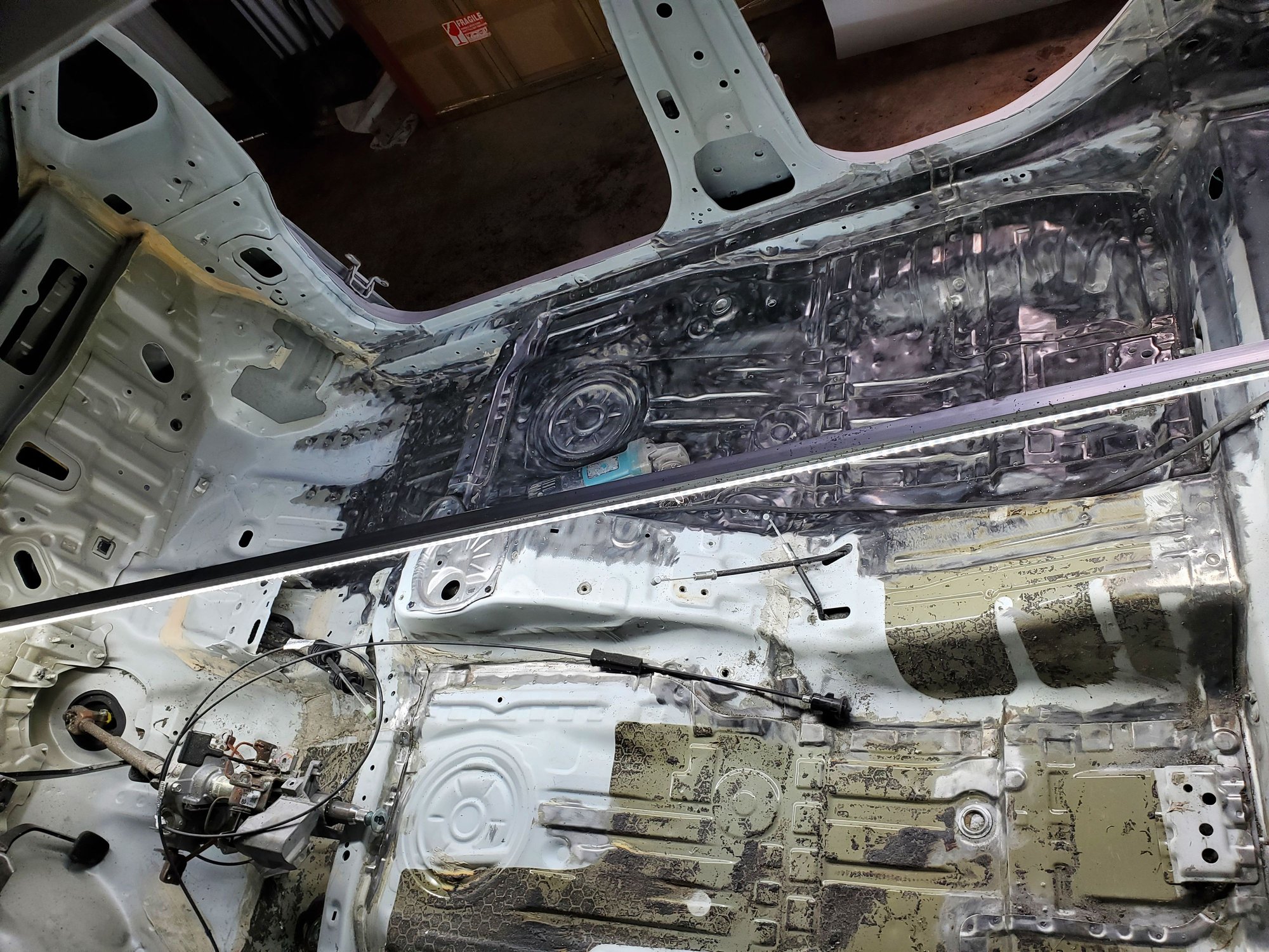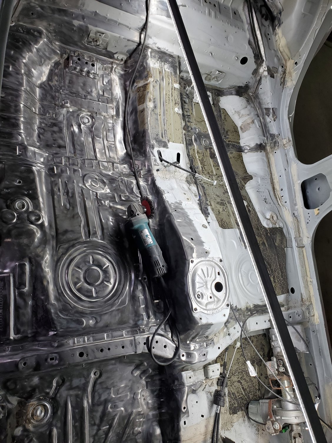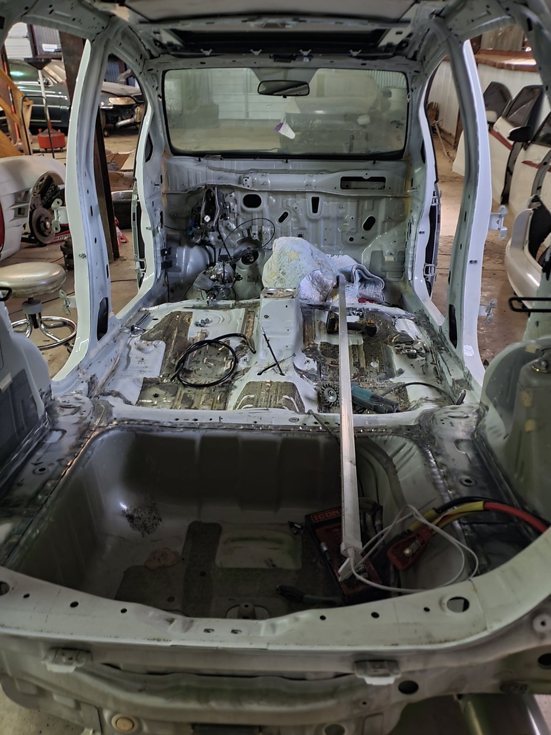 we left the dash in for now. I'm having all the panels stitch welded which means removing all the seam sealer. I think he's going to weigh it before the roll cage. I'm hoping for 2200lbs... roll cage could be up to 400 lbs... time will tell