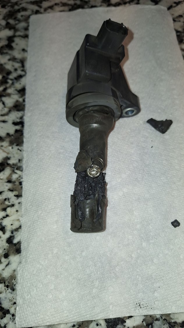 EDIT #2: Lightly tried to screw in spark plug....just fingertight....to see if there were any threads left. It did screw in. Again, only did it very lightly. But my guess is that with that deformation, the plug isn't going to seal properly and i'll just get gas/oil shooting into there? Is this a good guess? This is the destroyed coil pack This is inside and you can see the deformation at the bottom of the part the spark plug gets screwed into