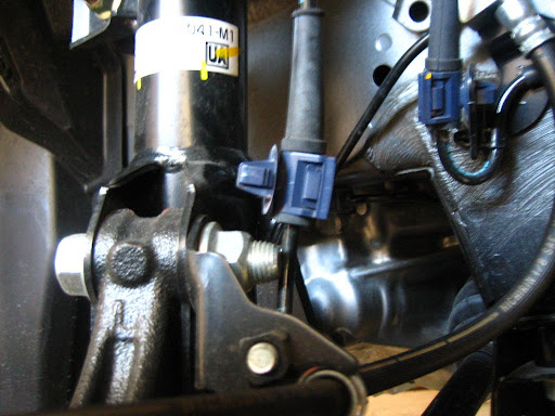 5. Unclip the blue ABS sensor clip by pinching the tabs. It is located near where the shock bolts to the knuckle. You may find that using a flat head screwdriver will help you push in the tabs.
