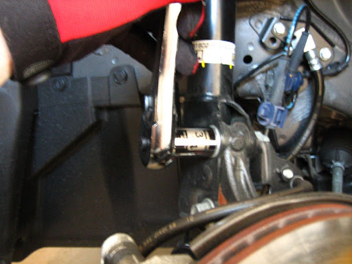 15. Reinstall the shock assembly onto the vehicle. You may find it easier to push the top section into the shock tower first, then pushing the end link bolt through the shock assembly hole. The next step would be pushing the lower section into the knuckle mounting. Be careful once again to not move the knuckle much while installing the shock assembly. This may take a bit of muscle. Tighten the nuts and bolt down to the factory torque specifications.