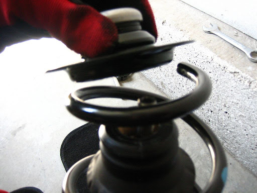 19. Remove the upper and lower rubber spring mounts from the stock spring and put them on the aftermarket spring. If you have a progressive rate aftermarket spring, the end of the spring with the tighter wound coils is the top.