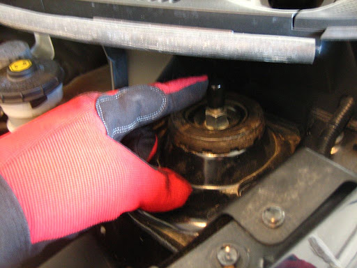 1. Open the hood and prop it with the rod. Locate the strut tower on the side you are working on. Remove small black plastic cap located on the bolt in the center of the strut tower.