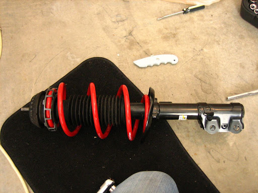 20. Install the rear spring by putting the aftermarket spring into the lower perch and using the floor jack to lift the spring perch enough so that the 14 mm bolt will fit back into the strut. Tighten down to the factory torque specification of 40 ft-lbs.