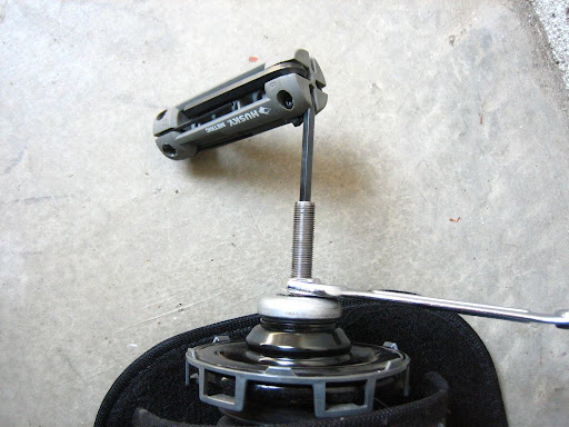 10. Put the 6 mm allen wrench into the end of the top bolt of the shock. This stops the shaft from turning. Use the combination wrench to loosen the bolt on the end while holding the allen wrench. This will be releasing the tension of the spring. Normally, a spring compressor would be used to avoid any danger of the springs tension causing injury as the bolt is removed. The spring is not under very much tension, so a spring compressor is not necessary on this application. For safety, you may want to stand with one foot on the spring as the nut is coming off. You may want the help of a friend on this.