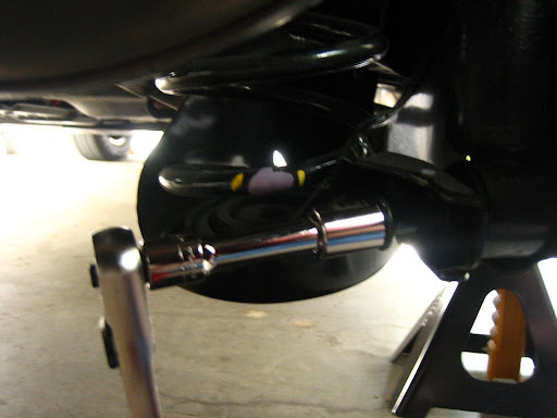 18. Once the 14 mm bolt is removed, you will be able to remove the spring. If you have used a floor jack to support the lower spring perch, remove it now. If you have not removed the rear wheel, you can push down on the wheel and tire which will drop the perch down enough to pull the spring out. Otherwise you can push down by other means to drop the lower spring perch and pull the spring out.