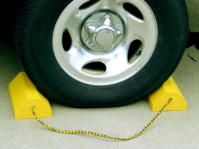 Use a set of wheel chocks wedged against the tires on the ground.