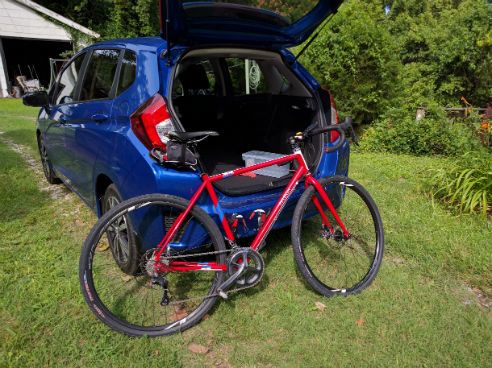 "My bike fits in the Fit." could you please elaborate on this. your bike size, your height, inseam. Are you removing the front wheel and clamping in the fork? Laying the bike down? back wheel in first? I'm trying to get a better Idea of if my bike will fit without actually taking it to the dealer. I'm hoping to put the back wheel in first with the forks clamped to the floor. BTW I ride a 54' frame with a 32 inseam. Any info would be helpful. Also congrats on your purchase.