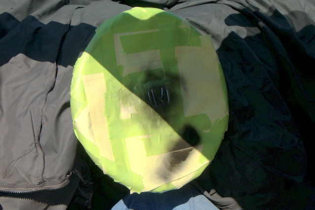 9: Have your dad take over. I'm not terribly experienced with painting, especially with a rattle can, so I let my dad take over at this point. As you can see, my masking job was insufficient, so he closed up a couple openings with some tape.