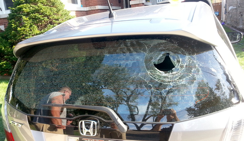sorry to see but that looks so comical. i didn't know baseballs go right though the glass like that. i would talk to your insurance agent for comments. that's a comprehensive coverage.
