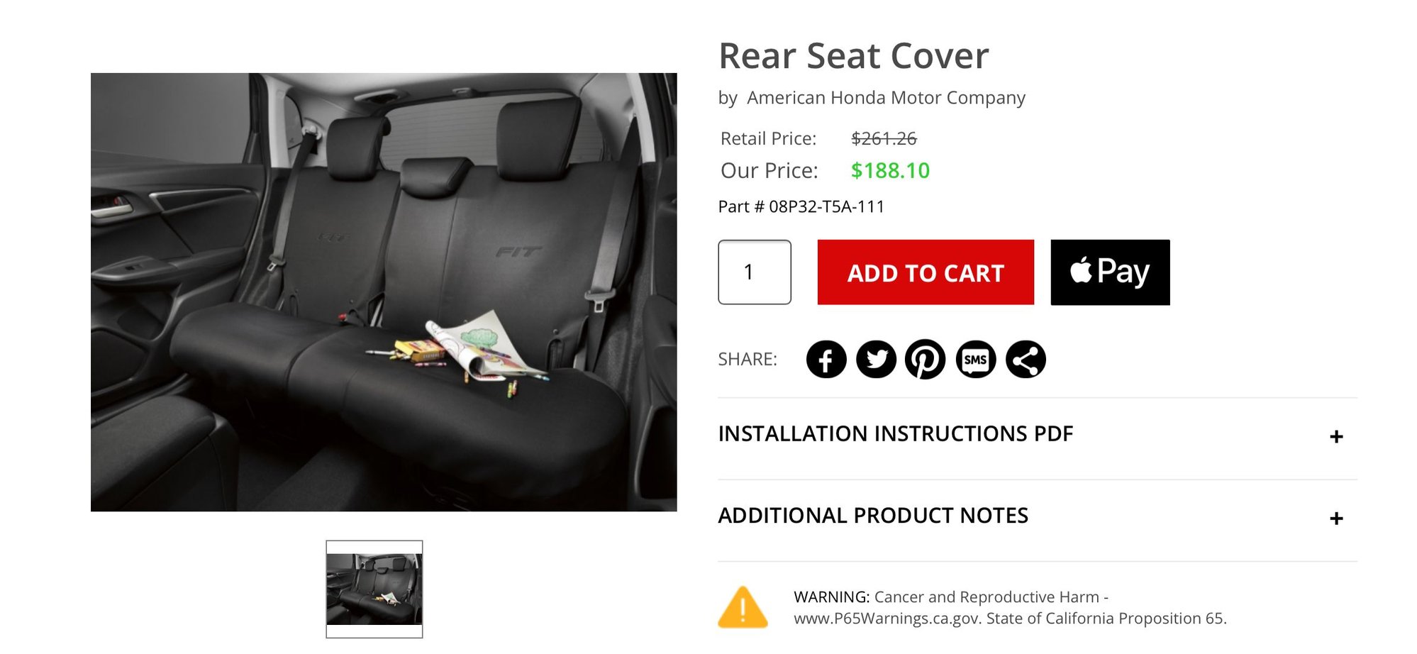Rear Seat Cover 08P32-T5A-111 (Has minor tear as seen in photos)